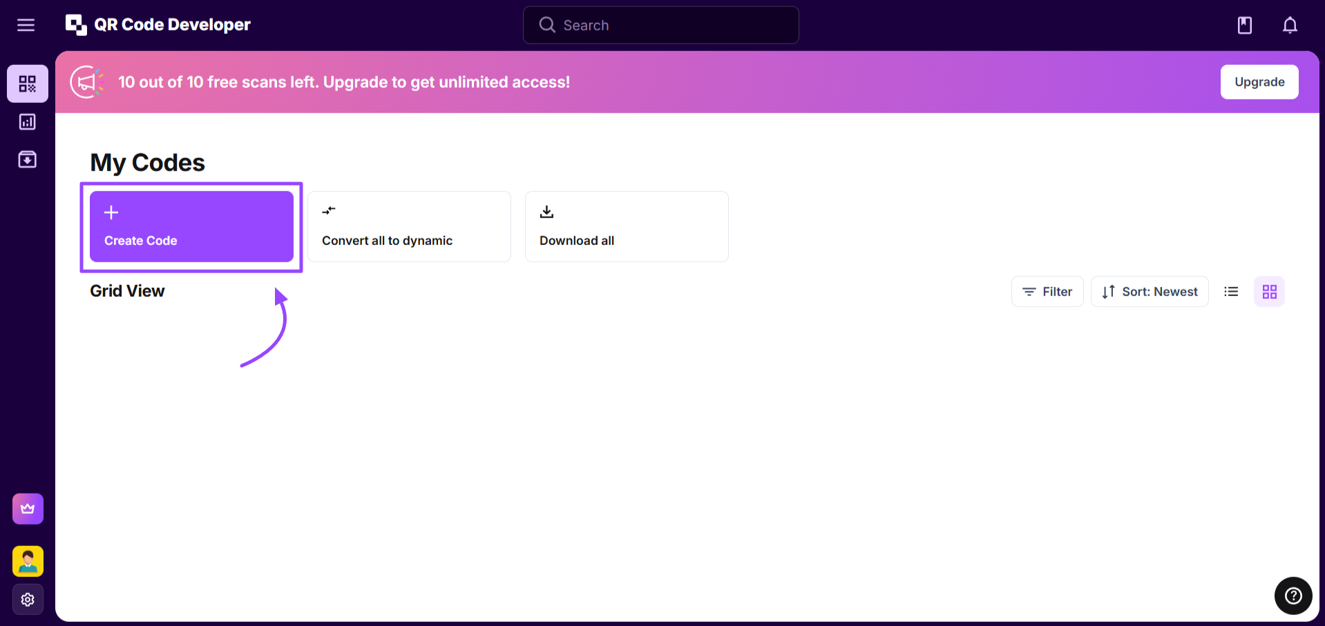 Step 2: Go to Your Dashboard Once you log in to QR Code Developer, it will automatically redirect you to the Dashboard. Now, you have full access to your account to create the QR codes of your choice. To create a QR code, click on the Create Code button under the My Codes tab, and you’ll automatically move further to the next steps.