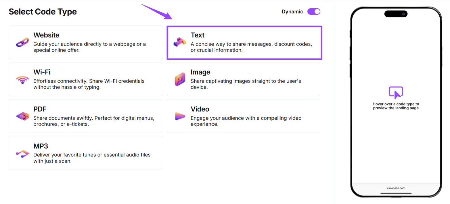 Step 3: Create Your Wedding Invite Text QR Code Now, we’ll create a Text QR code to share a personalized message with all your guests. For this, choose the Text option while selecting Select Code Type.