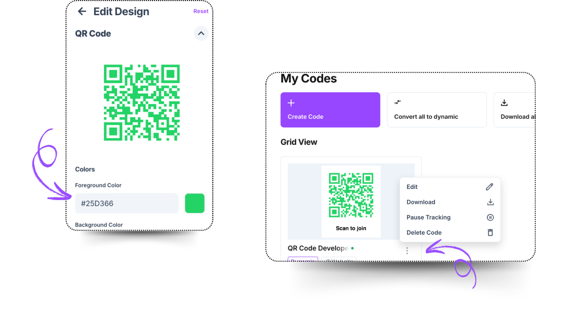 Cela est souvent dû à un contraste insuffisant ou à des problèmes de conception. Si le contraste du code QR est insuffisant, certains appareils ne pourront pas le scanner. Vous pouvez personnaliser les couleurs de votre code QR, mais veillez à choisir des couleurs de premier plan et d'arrière-plan contrastées.